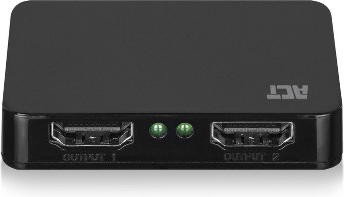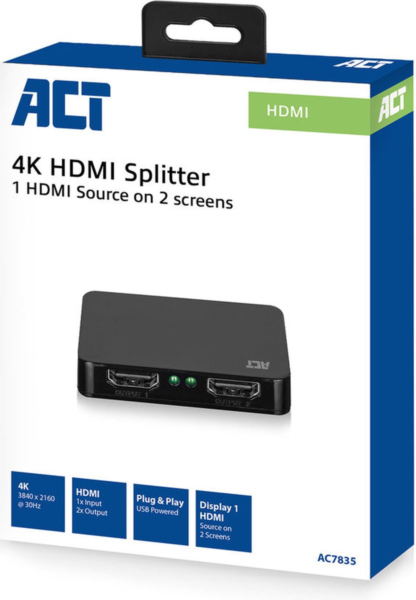De ACT AC7835 4K HDMI Splitter splitst een enkel HDMI-signaal naar twee aparte tv’s/schermen. Sluit de AC7835 aan met een High Speed HDMI-kabel met een maximale 4K resolutie van 3840×2160 @ 30Hz en (3D) resolutie van 1080p @ 60Hz. De AC7835 wordt geleverd met een USB stroomkabel.