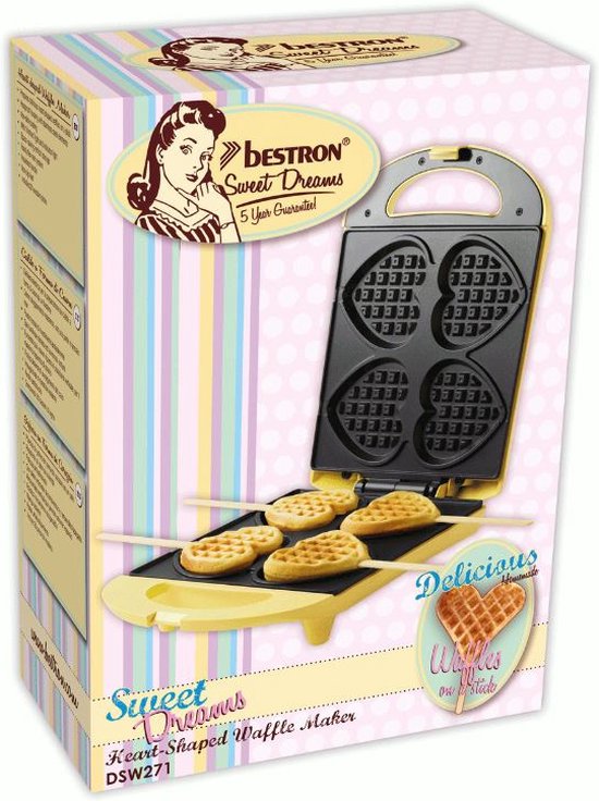 Bestron Wafelijzer – DSW271 – 1400W – 4 mini hartvormige wafels – incl. 20 houten stokjes – Geel