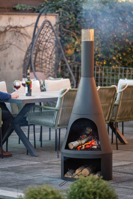 De haard wordt standaard geleverd met een vuurpook en houtrooster, zodat je direct kunt genieten van een knapperig haardvuur in jouw tuin.