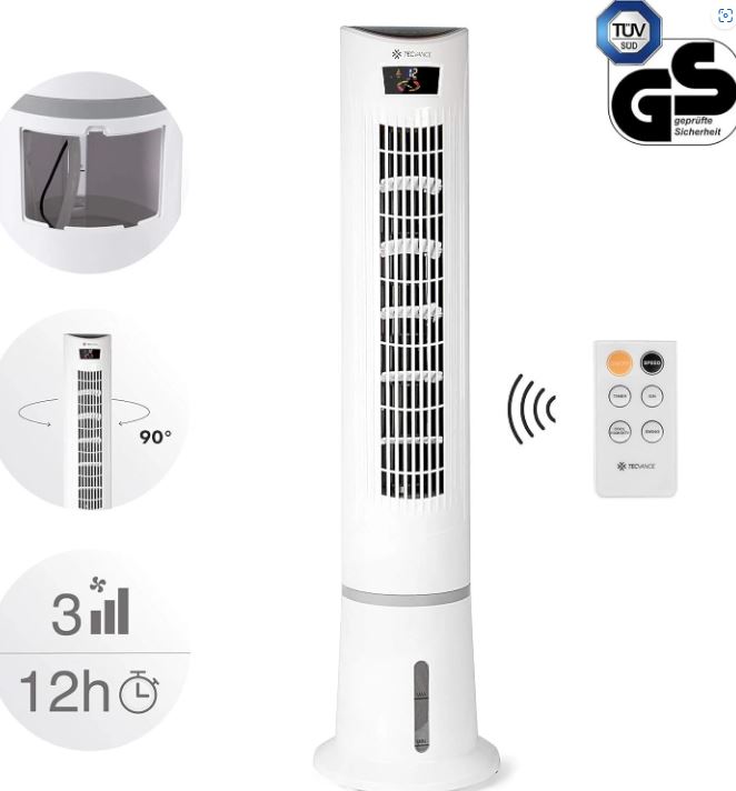• Luchtkoeler – met een geïntegreerde 3-liter watertank, die je kunt vullen met water of ijsblokjes voor een extra verkoelend effect